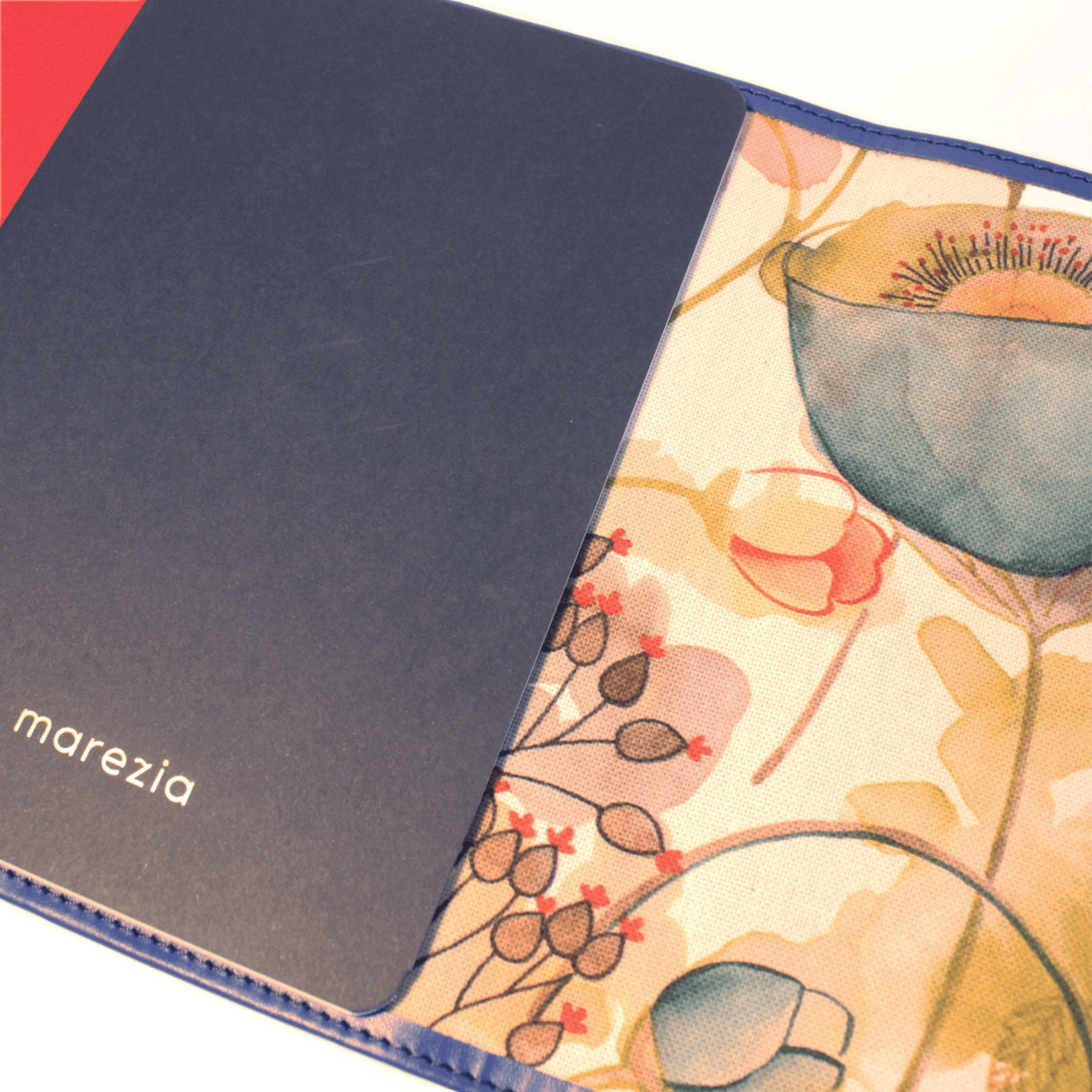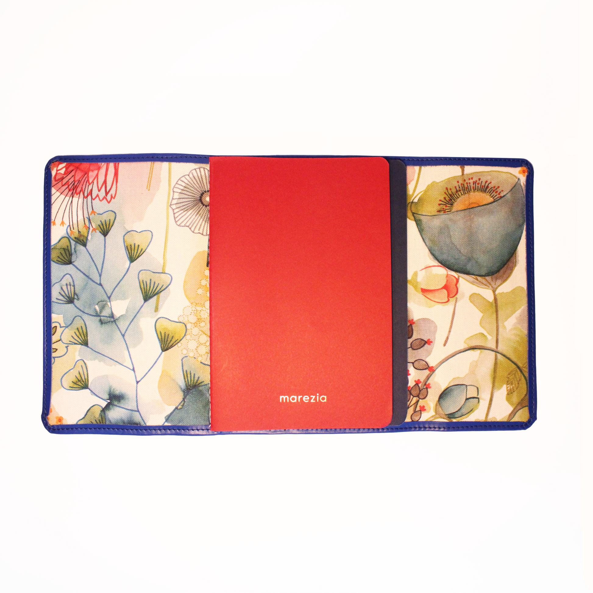 Blue leather with Watercolor fabric interior.