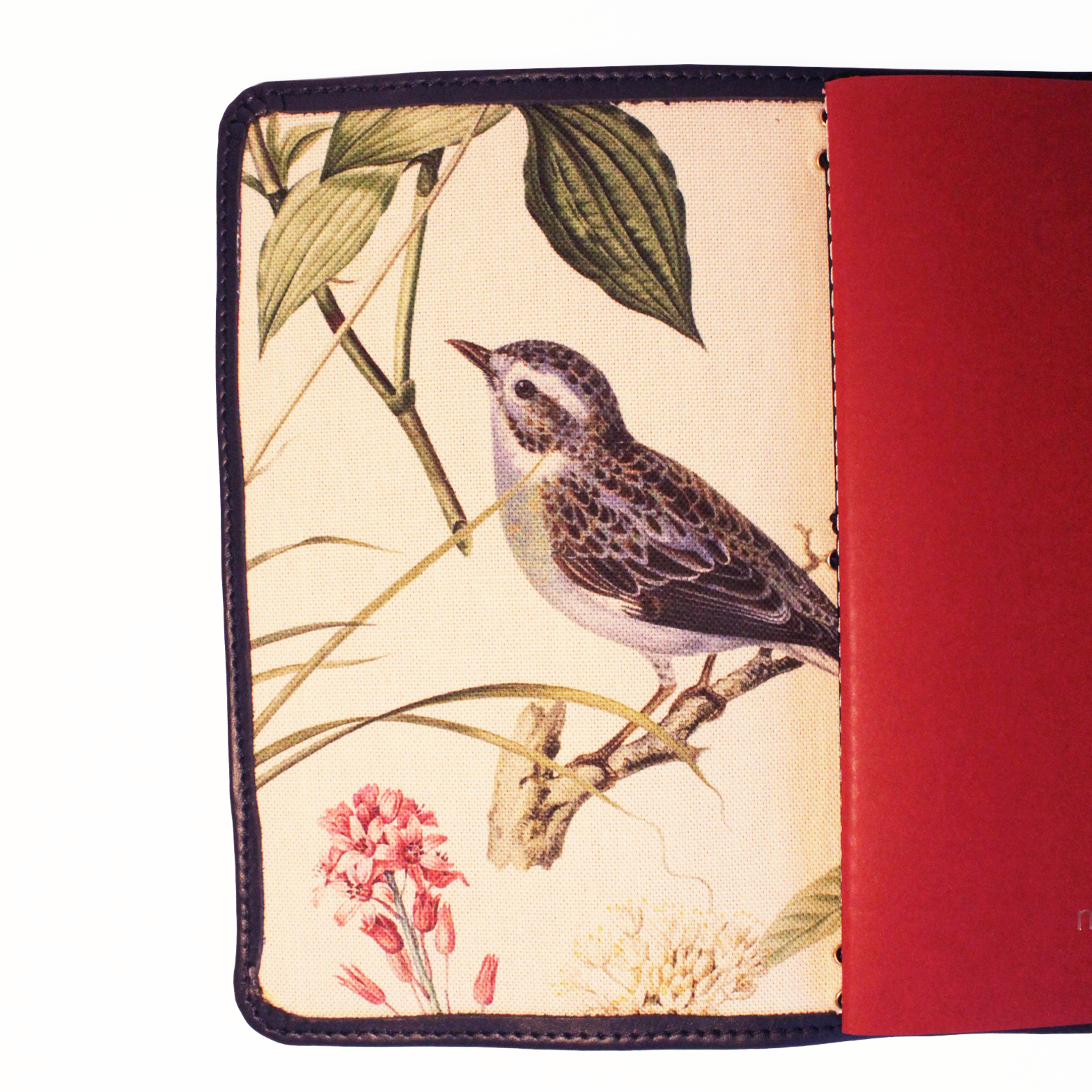 Indigo leather with Birds fabric interior.